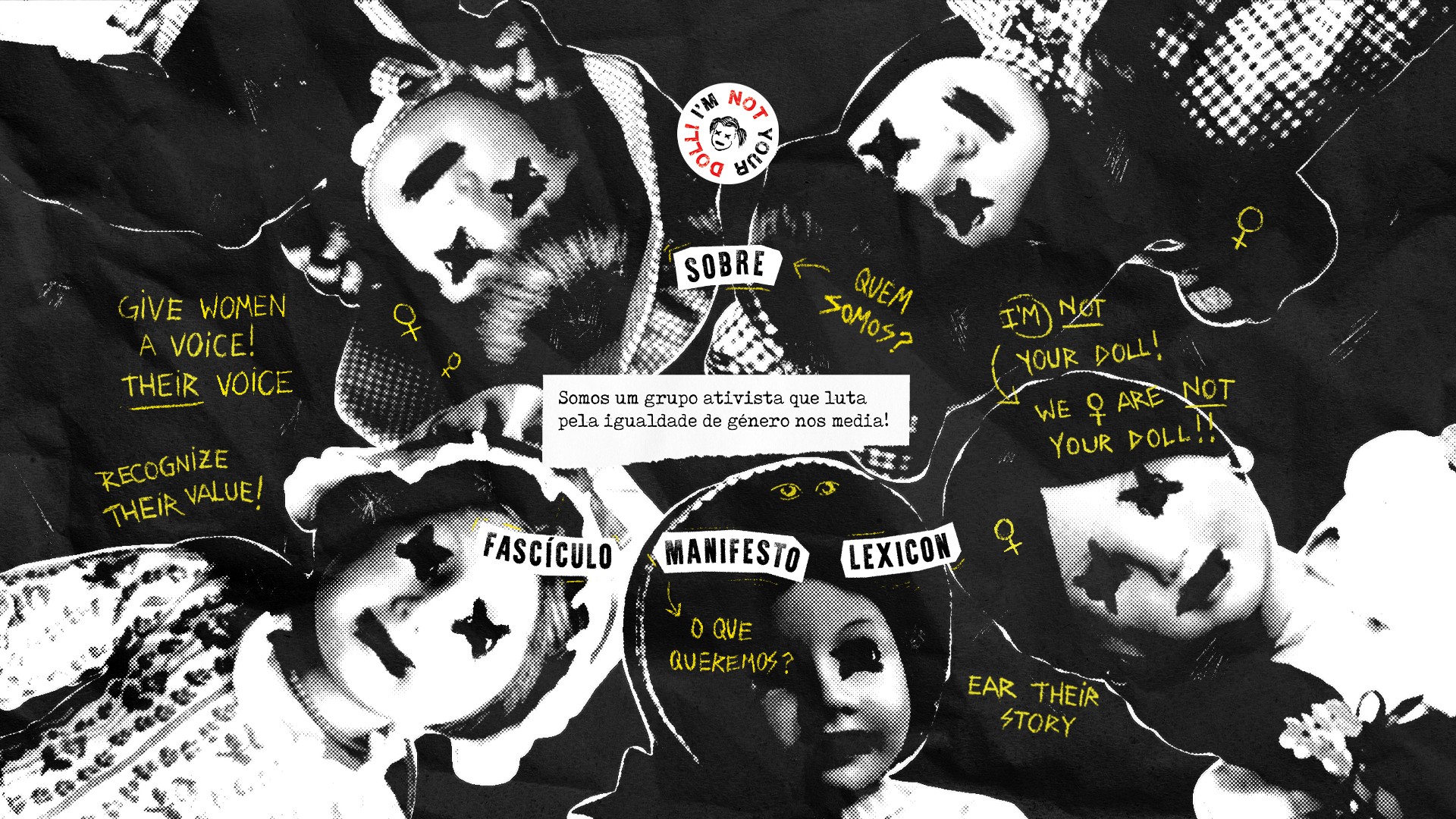 Publicação sobre mulheres com respetivo website de divulgação. - Fazendo uso do elemento da boneca e simbologia associada à mesma, expressa uma intenção de revolta e protesto relativemente à posição das mulheres nos media.