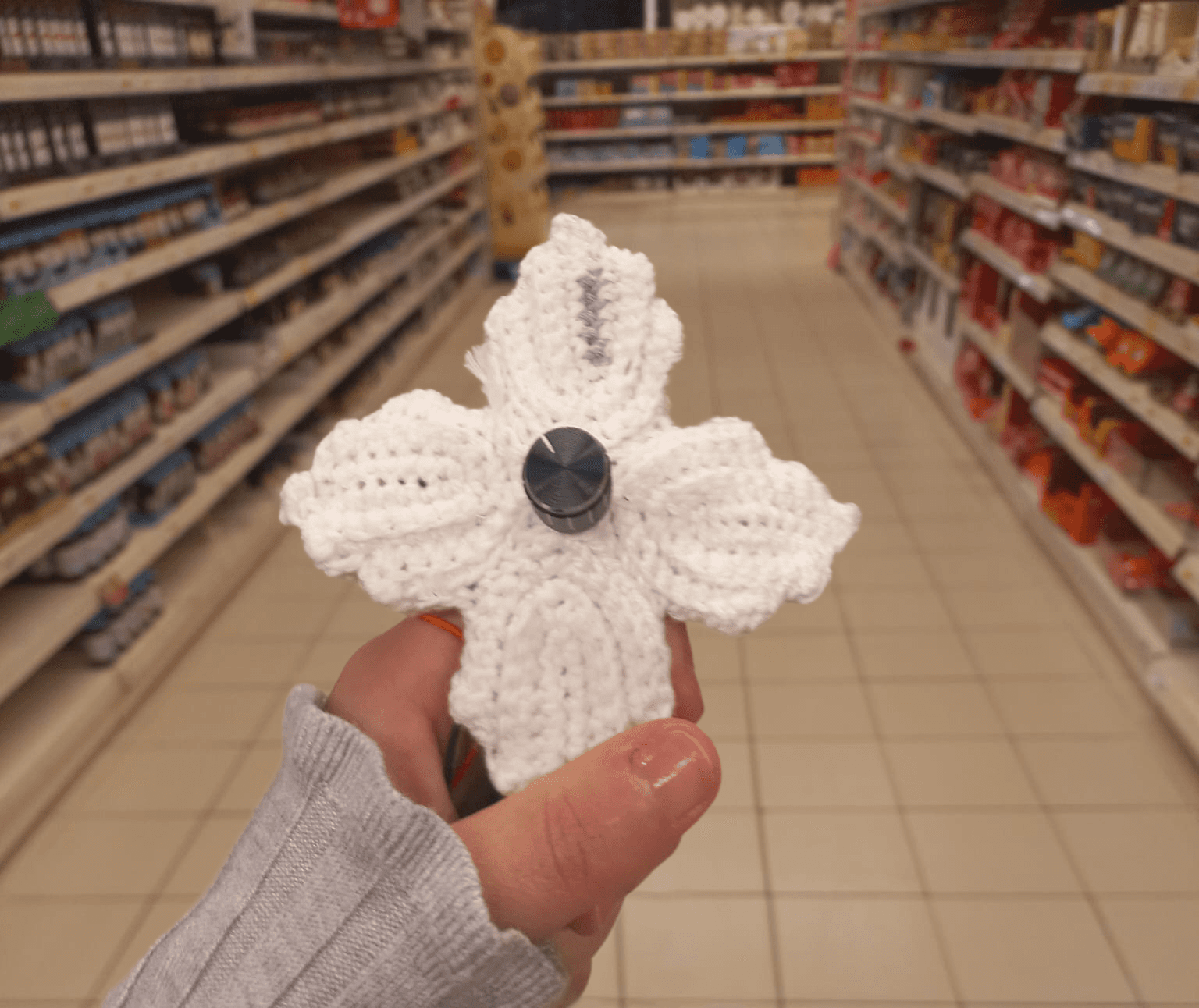 Objeto interativo feito de crochê que juntando o tangível ao digital auxilia os idosos no processo de compra em hipermercados. - O seu propósito é de resolver as principais dificuldades identificadas por este grupo etário durante as compras, e melhorar a sua inserção na atual sociedade tecnológica através da conjugação de elementos que lhes são familiares e tecnologia assistiva.