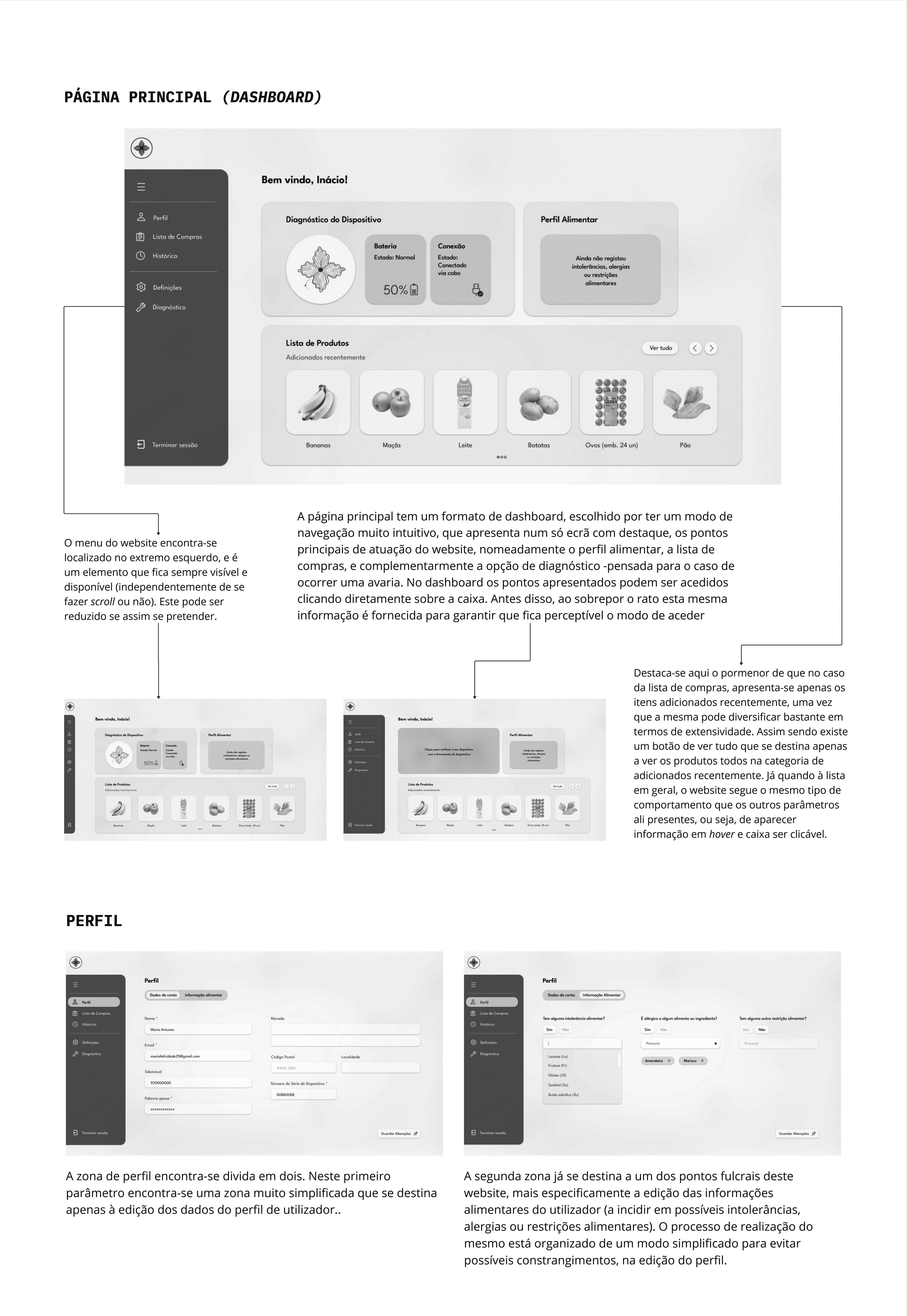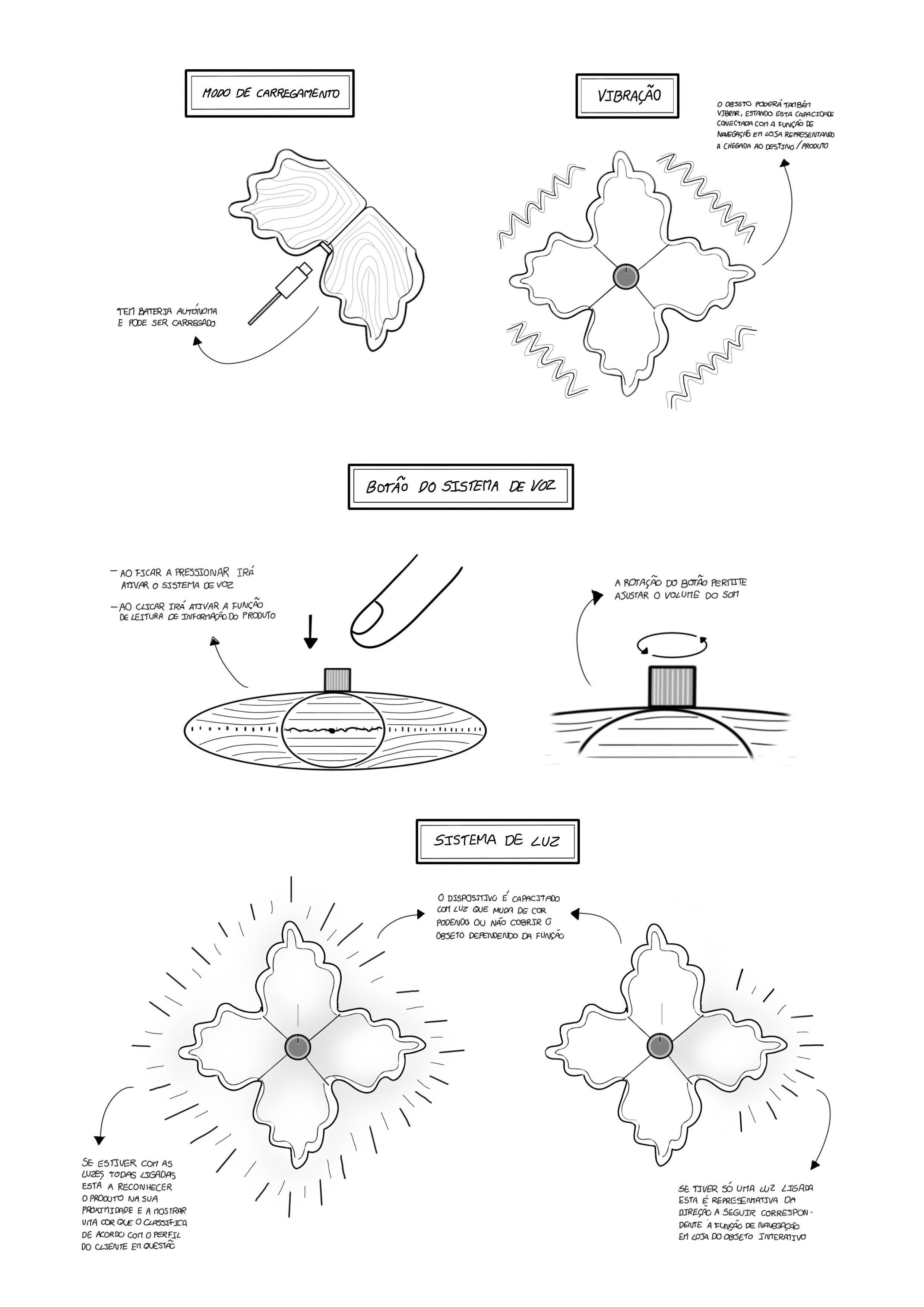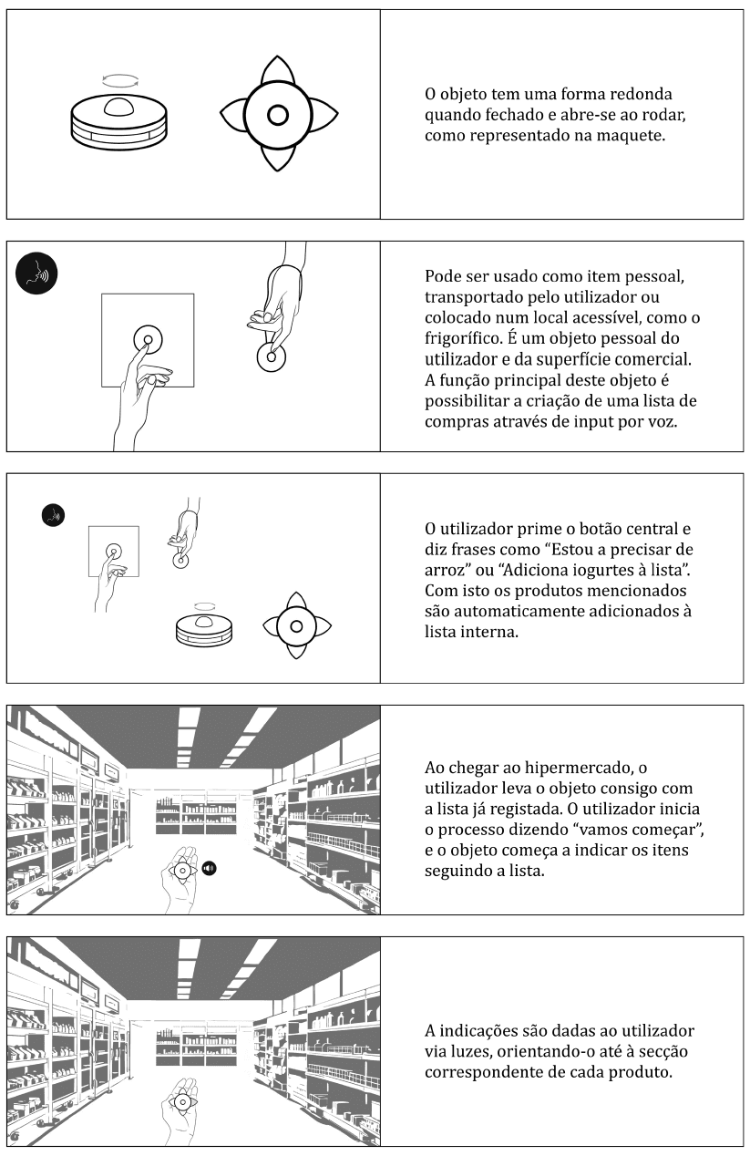Por fim, considerando os resultados obtidos na fase anterior seguiu-se para o desenvolvimento do conceito final e prototipagem do mesmo. A primeira parte desta etapa, referente à consolidação da ideia, contou com a realização de esquemas orientativos, User Journeys, User Flows e Storyboards. Já o processo de prototipagem em si, consistiu em múltiplos estudos e tentativas, que foram gerando iterações tanto a nível da forma do objeto desenvolvido, como da configuração dos elementos tecnológicos que se encontravam no seu interior. Por fim, este extenso processo de research through design deu origem a um protótipo final otimizado semi-funcional.