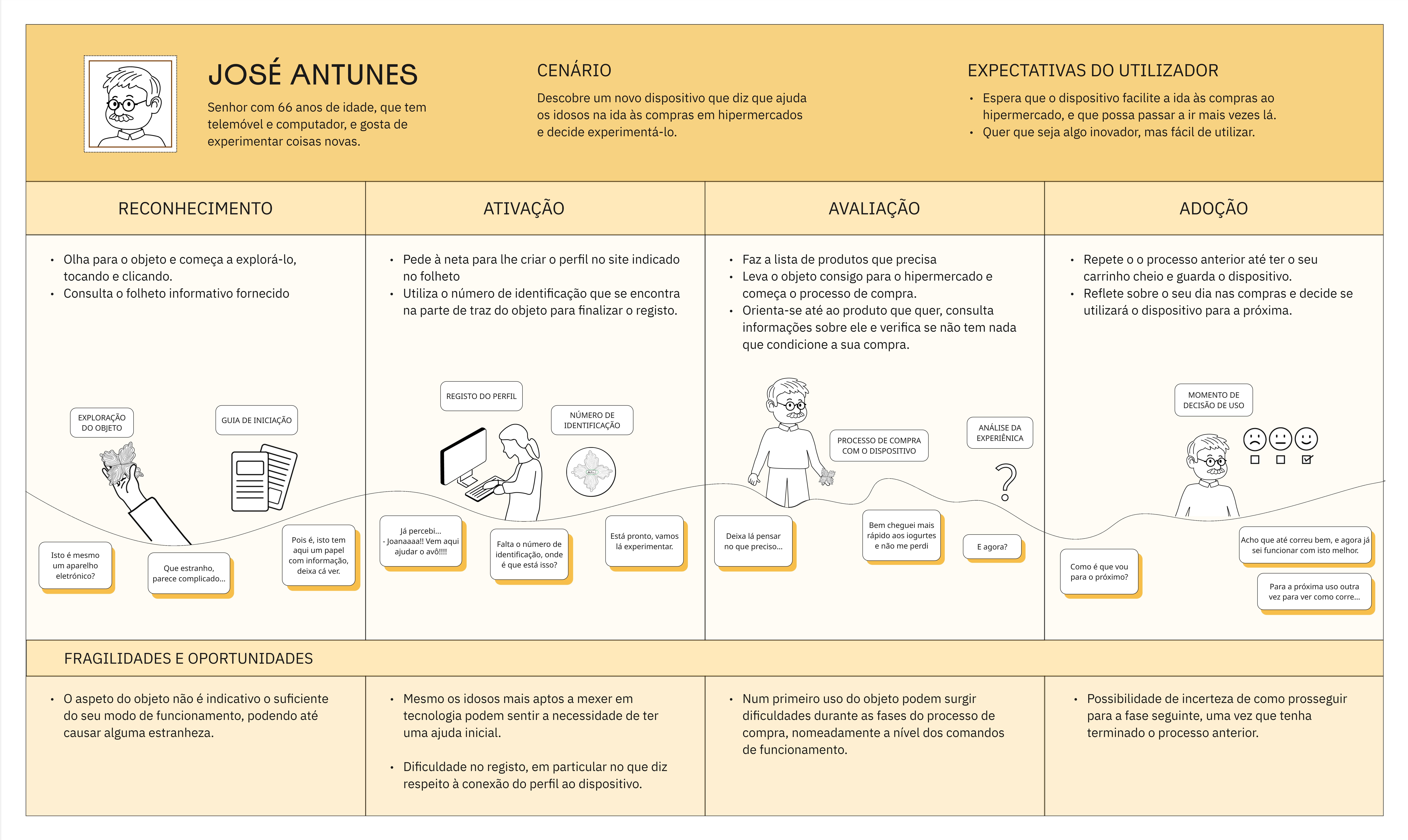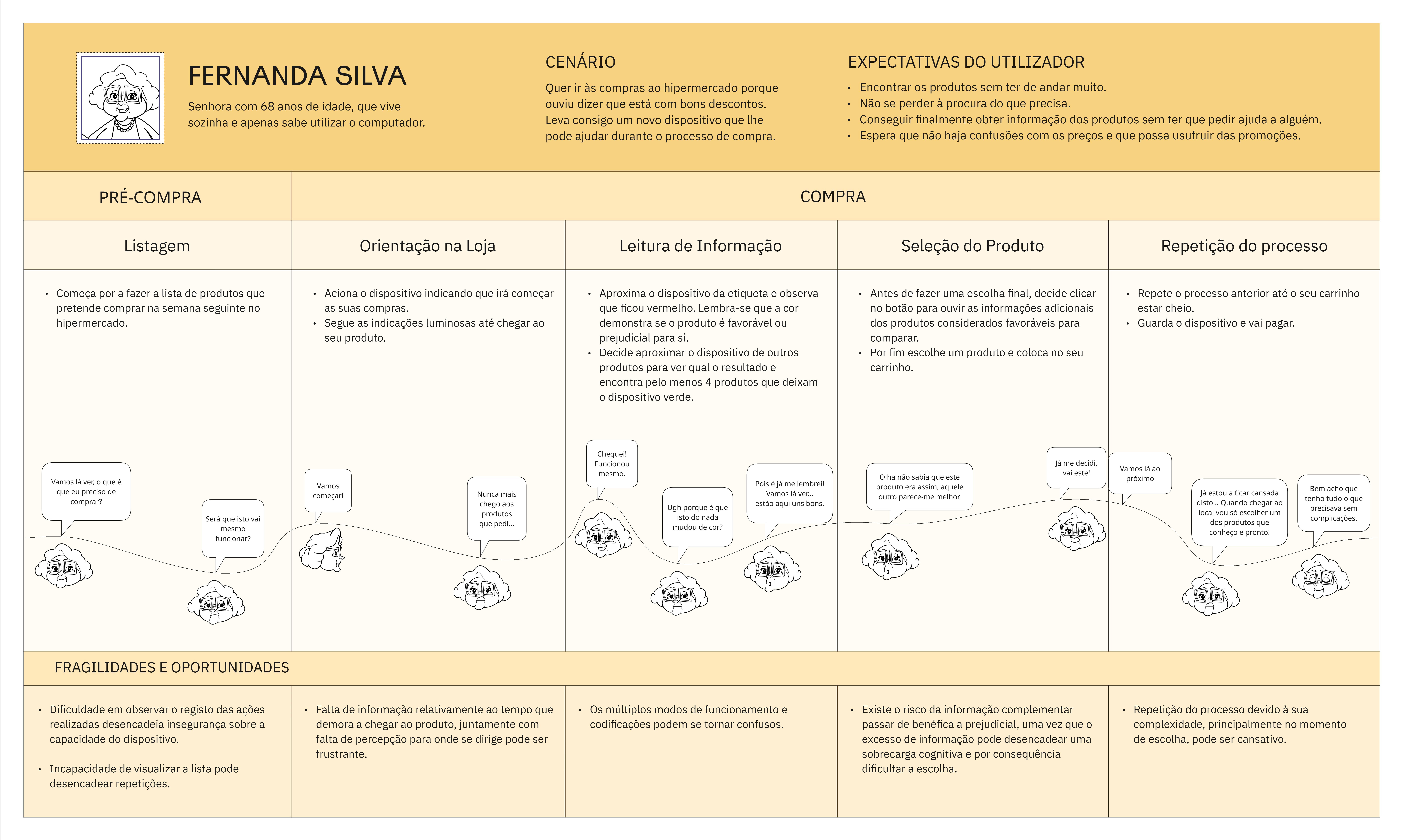 A primeira etapa do projeto centrou-se na análise da experiência de compra dos idosos em grandes superfícies comerciais, como super e hipermercados, começando com uma Observação Fly-on-the-Wall, organizada segundo o modelo AEIOU, à qual se seguem entrevistas exploratórias com funcionários das superfícies comerciais e por fim o cruzamento e análise da informação obtida. É de realçar que foi realizada uma revisão de literatura prévia com foco no conceito consumidor sénior e no espaço de compra